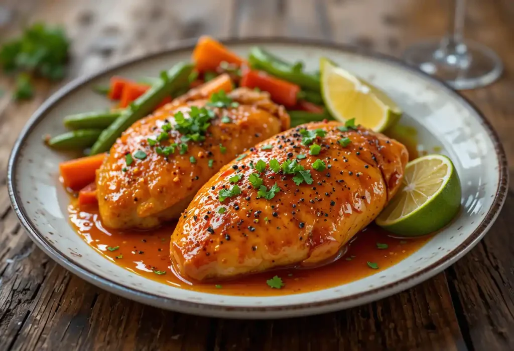 "Succulent Sweet and Spicy Honey Pepper Chicken glazed in a golden honey sauce, garnished with black pepper, cilantro, and lime, served with roasted vegetables on a rustic wooden table."